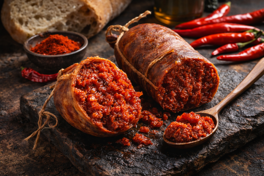 Outside Calabria, ‘nduja is often treated as a spicy novelty ingredient, a pizza topping, a pasta hit, a trendy charcuterie board inclusion. Inside Calabria, it’s something else entirely: a staple, a cultural artifact, and a functional preservation technique developed in a region where poverty historically demanded nothing be wasted.
