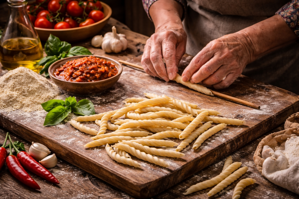 The shape isn’t decorative. It’s functional. The spiral structure and hollow core trap sauces, particularly the thick, oil-rich ragùs and ‘nduja-based sauces of Calabrian cooking, in a way that produces a completely different eating experience from dried pasta. The texture is firm with genuine chew. The flavor of the semolina comes through.